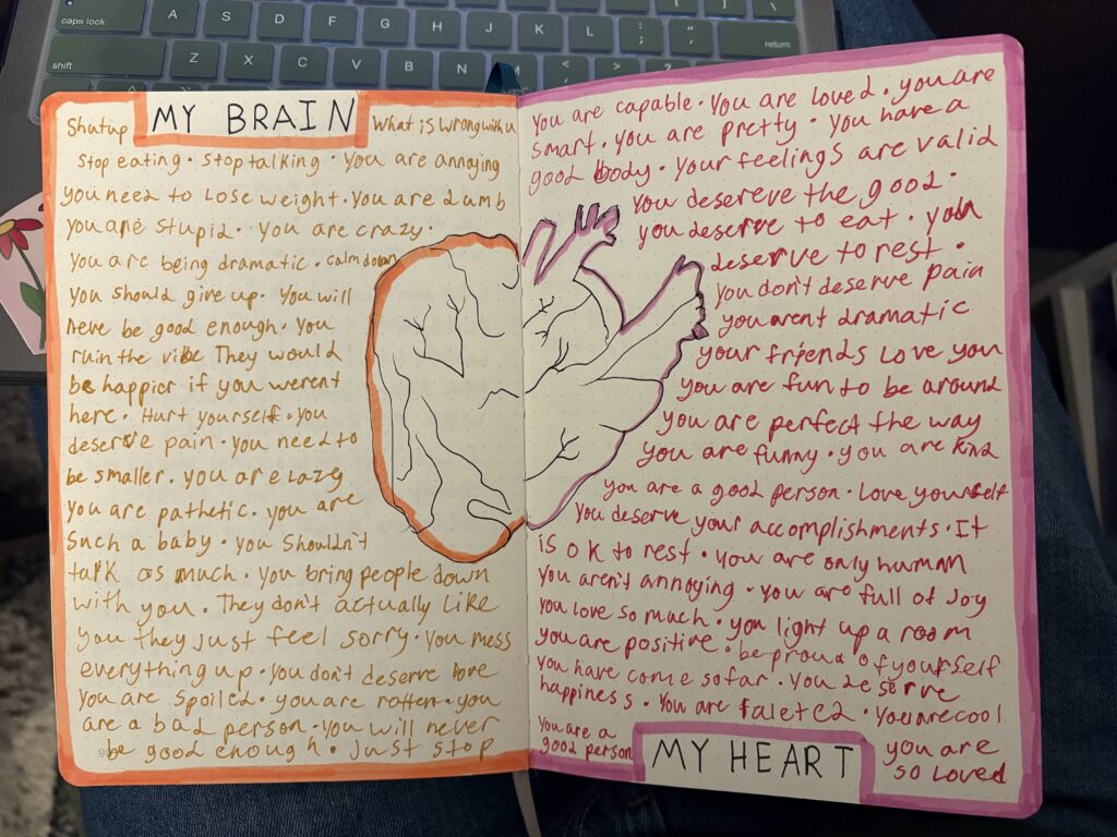 This project was inspired by this journal spread. It was made in a time I was really struggling with mental illnesses. My brain was telling me things in my heart I knew I did not believe. I really wanted to showcase the scary, isolating nature of mental illnesses because I know I am not alone in my experience. I want people to feel seen when they look at my art. These journal spread was never meant to be seen, It was made with the intetion of getting my thoughts and feelings on paper, but I relized how valuable it could be for someone else to feel heard.