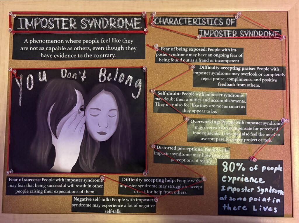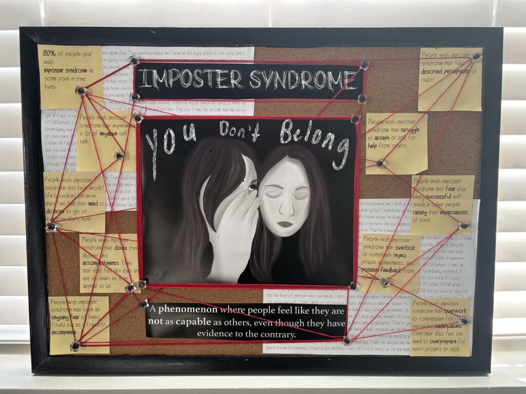 This piece, titled You Don’t Belong is based on the isolating, fearful nature of imposter syndrome. I want the viewer to feel seen, 80% of people experience imposter syndrome at some point in their life. The work shows people that they are not alone in this isolating experience. The main focus of the piece is a digitally drawn portrait of me whispering in my own ear, with the words “you don’t belong” floating above, which represents the constant voice in the back of my head saying, “I do not belong, I am not good enough, I got lucky.” This portrait is on a corkboard surrounded by facts about imposter syndrome, all connected by a red string. It was done as a PSA to bring awareness to imposter syndrome. The board is made to look like that of an investigator board, to symbolize the fear of being exposed as a fraud. Making it on a corkboard allowed it to truly communicate the message. I was very inspired by Barbara Kruger when making this piece, as she uses a lot of achromatic imagery as well as a red motif in a lot of her artwork. I did this as the portrait is an achromatic drawing, and the string is a red motif throughout. Kruger’s work also often conveys serious themes and messaging, and the way she does so inspires me. Her themes capture the viewers’ attention because of the saturation contrast between the red and the achromatic images.